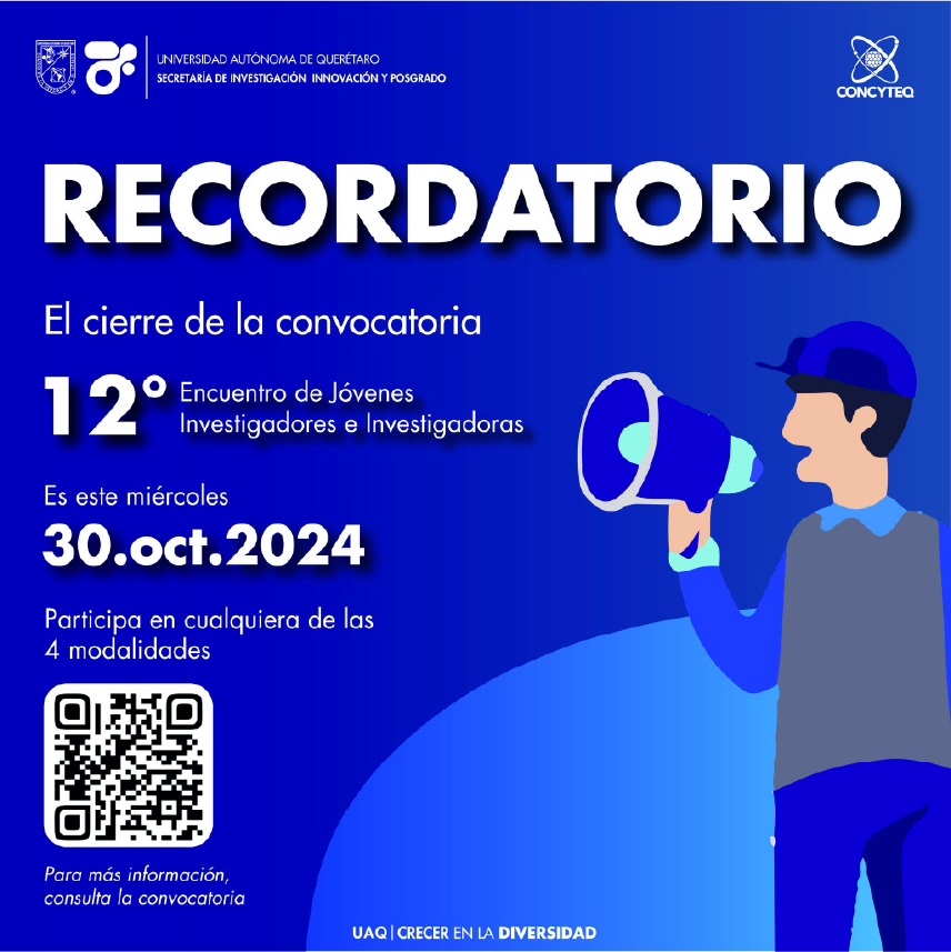 ¡Bienvenidas y bienvenidos al 13° Encuentro de Jóvenes Investigadores e Investigadoras UAQ! El Encuentro de Jóvenes Investigadores e Investigadoras, surge con el con el objetivo de fortalecer la formación en la investigación humanística, científica y tecnológica de las y los estudiantes, promover su inserción en programas de posgrado, fomentar su participación en la divulgación científica, la retribución social y el acceso universal al conocimiento.
